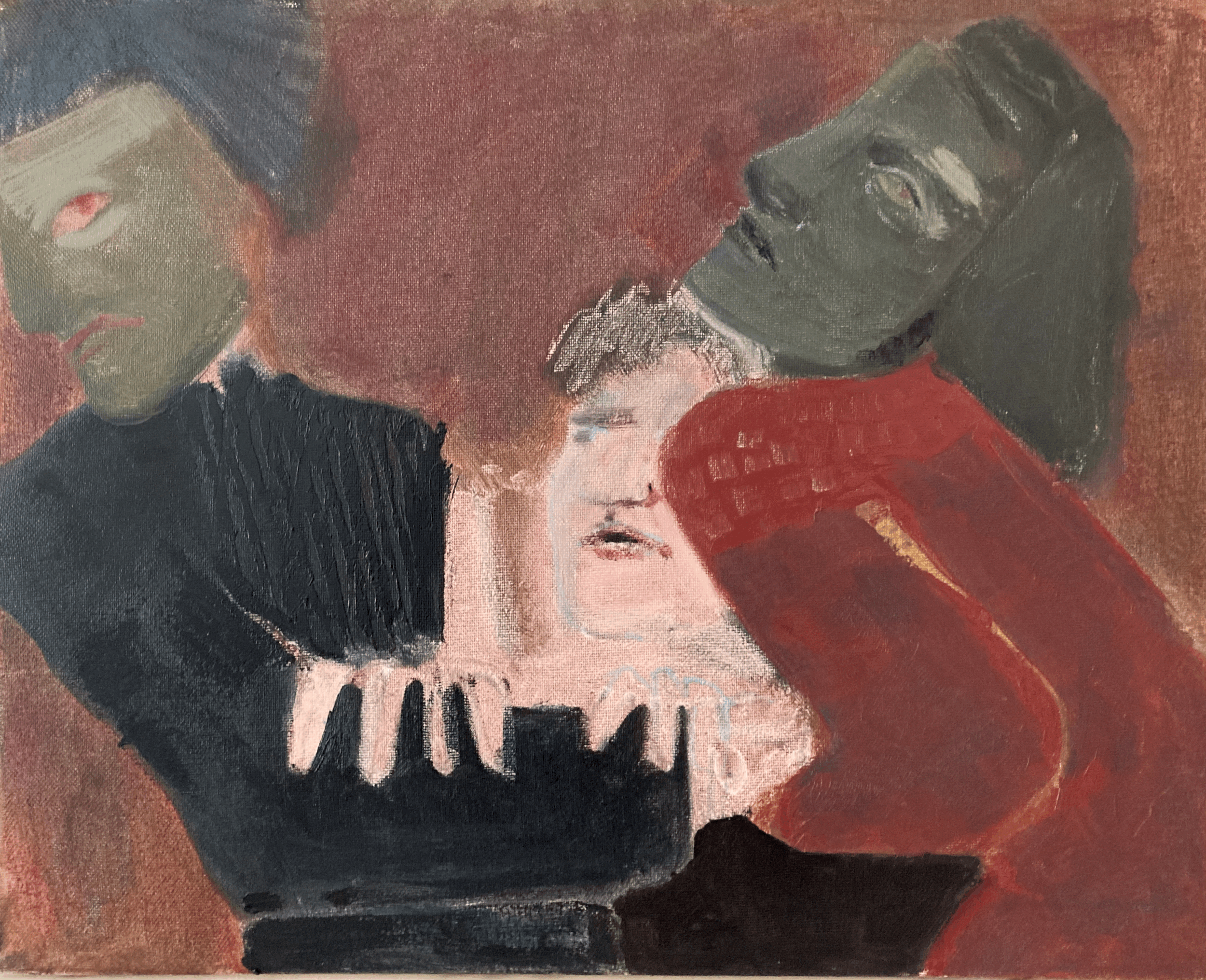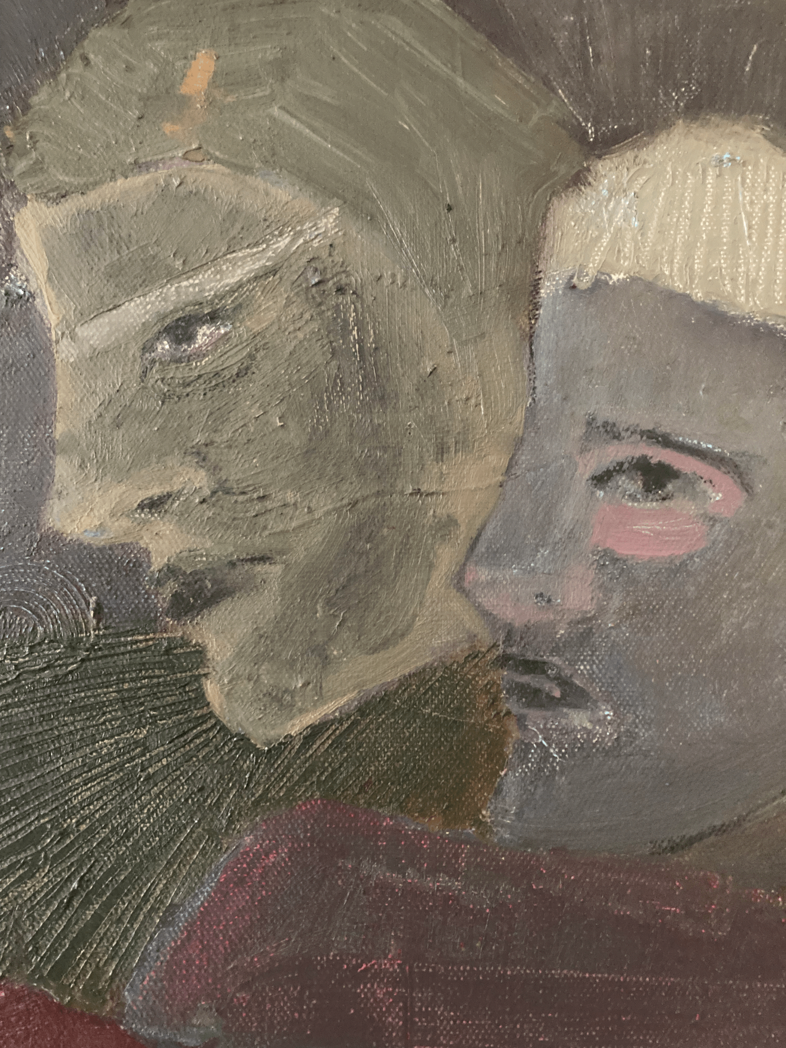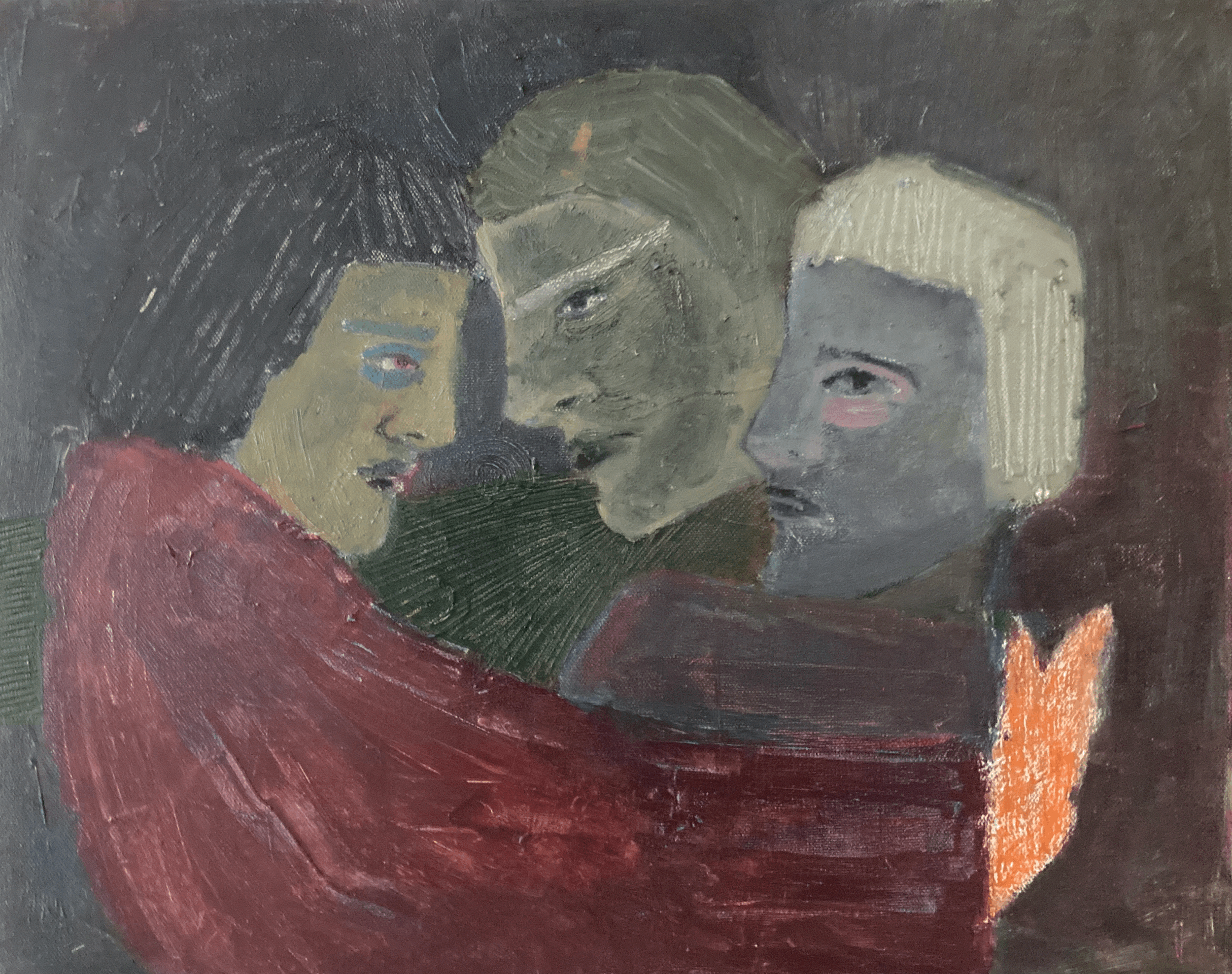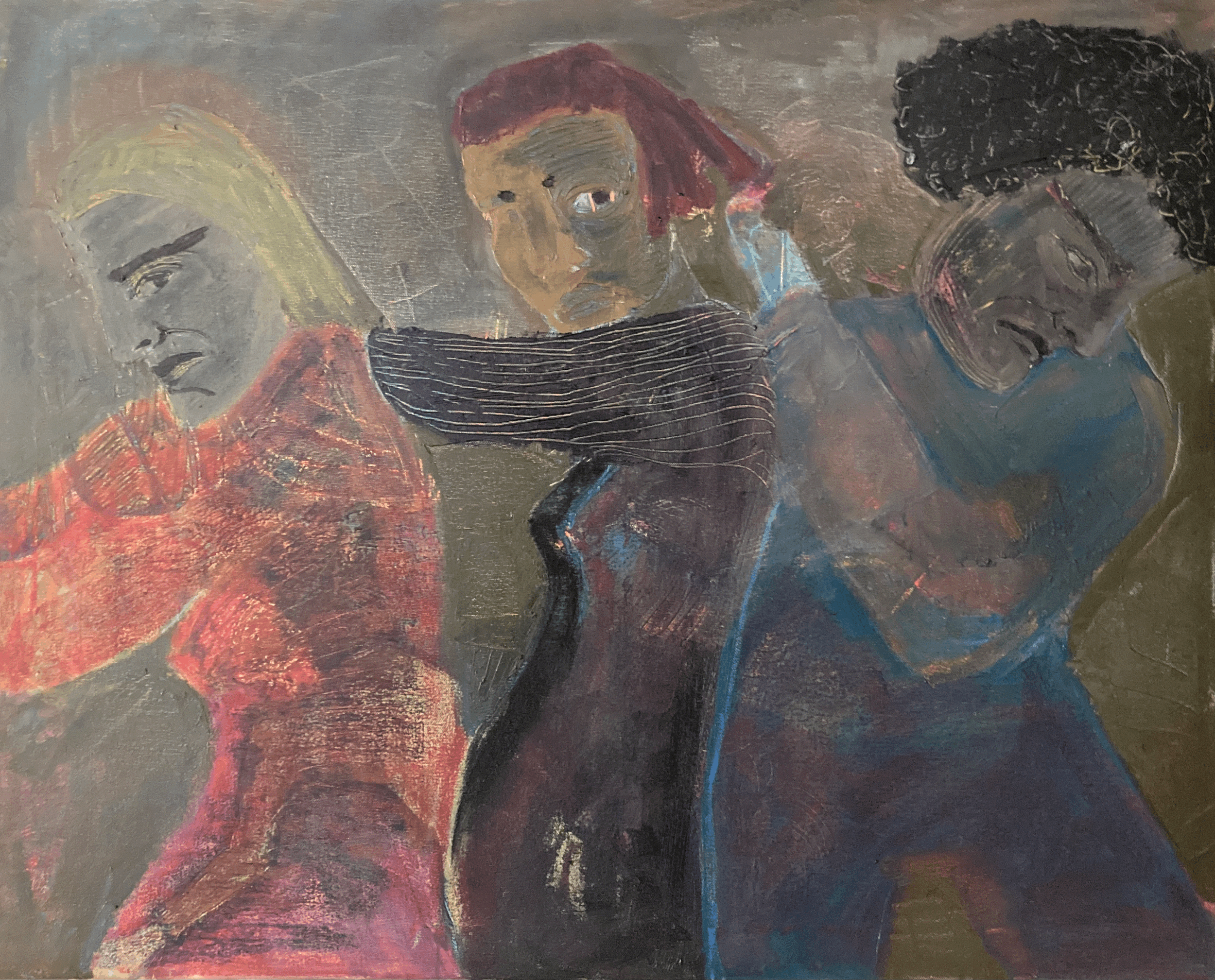 This collection is largely self-referential, working as a conversation between poetry, memory and self-portrait to create symbolic compositions that reconcile and eternalise significant female relationships. The manipulation of the surface sludge of paint and pastel through scoring and scratching creates contours which make these bodies move. The paintings present female relationships as spectacular and conflictual and profoundly connected by love and shared experience. These faces wear specialised expressions of personal conflict and contradiction, celebrating the contemporaneous duality of all feelings in us; suspicion coexists alongside acceptance and anger can be balanced in tenderness. We are made up of all kinds of incoherent things and so are these paintings. The textural dimension of the work tries to contribute to this duality by physically working conflict into the painting, through the rigid and fluid acts of pressure that demonstrate we are as much one feeling as we are its opposite.