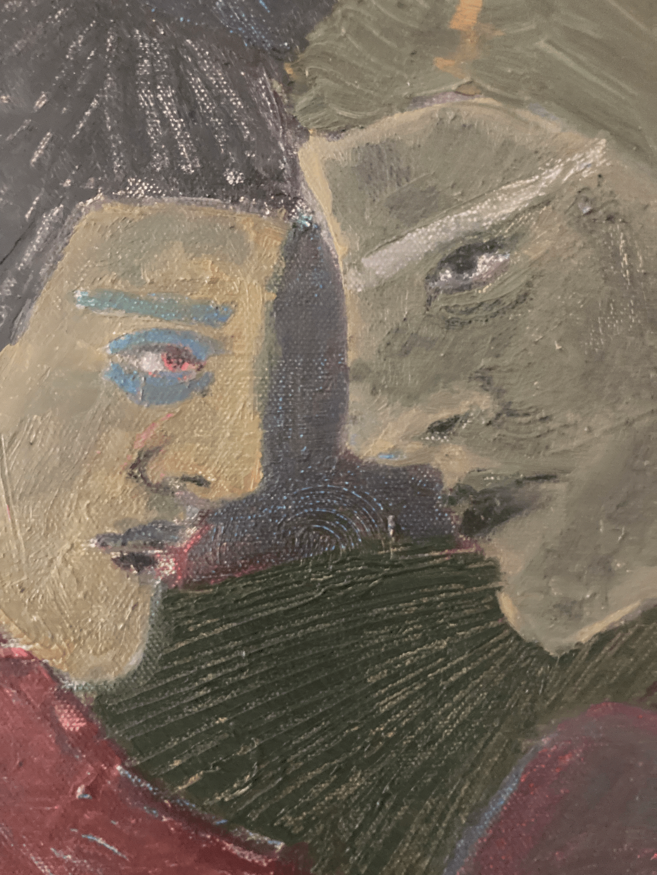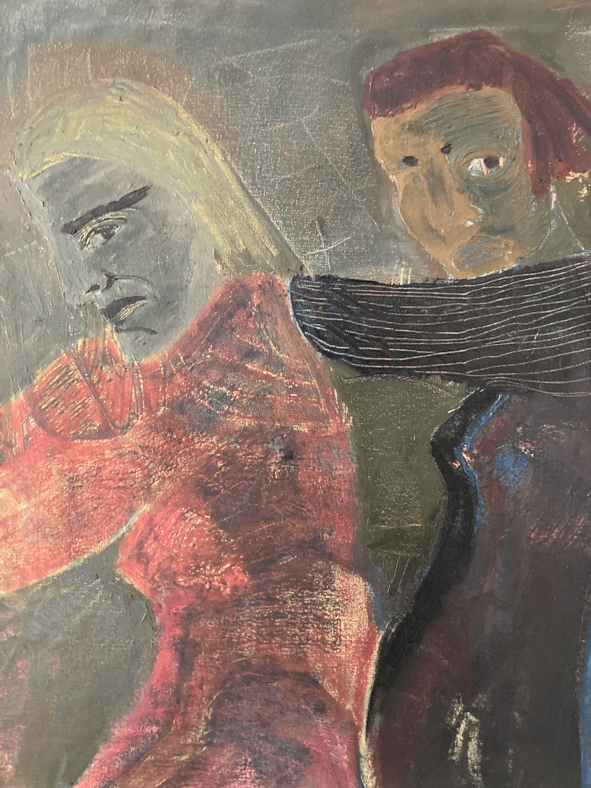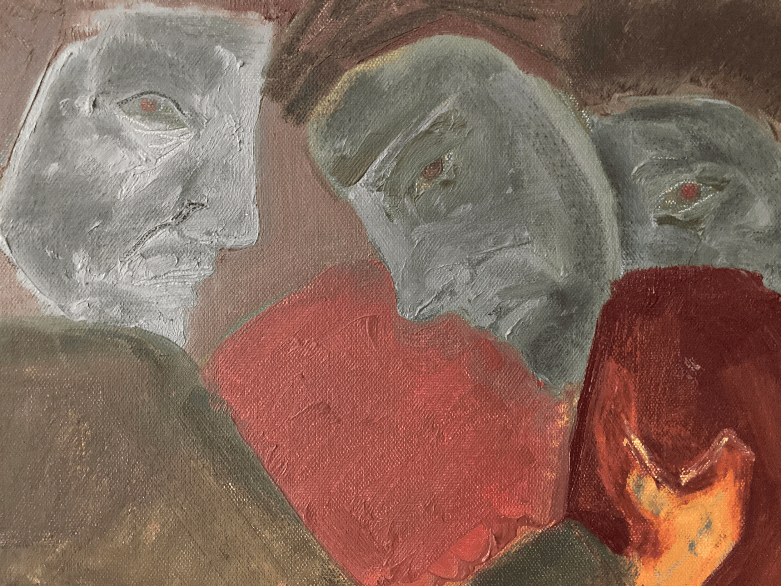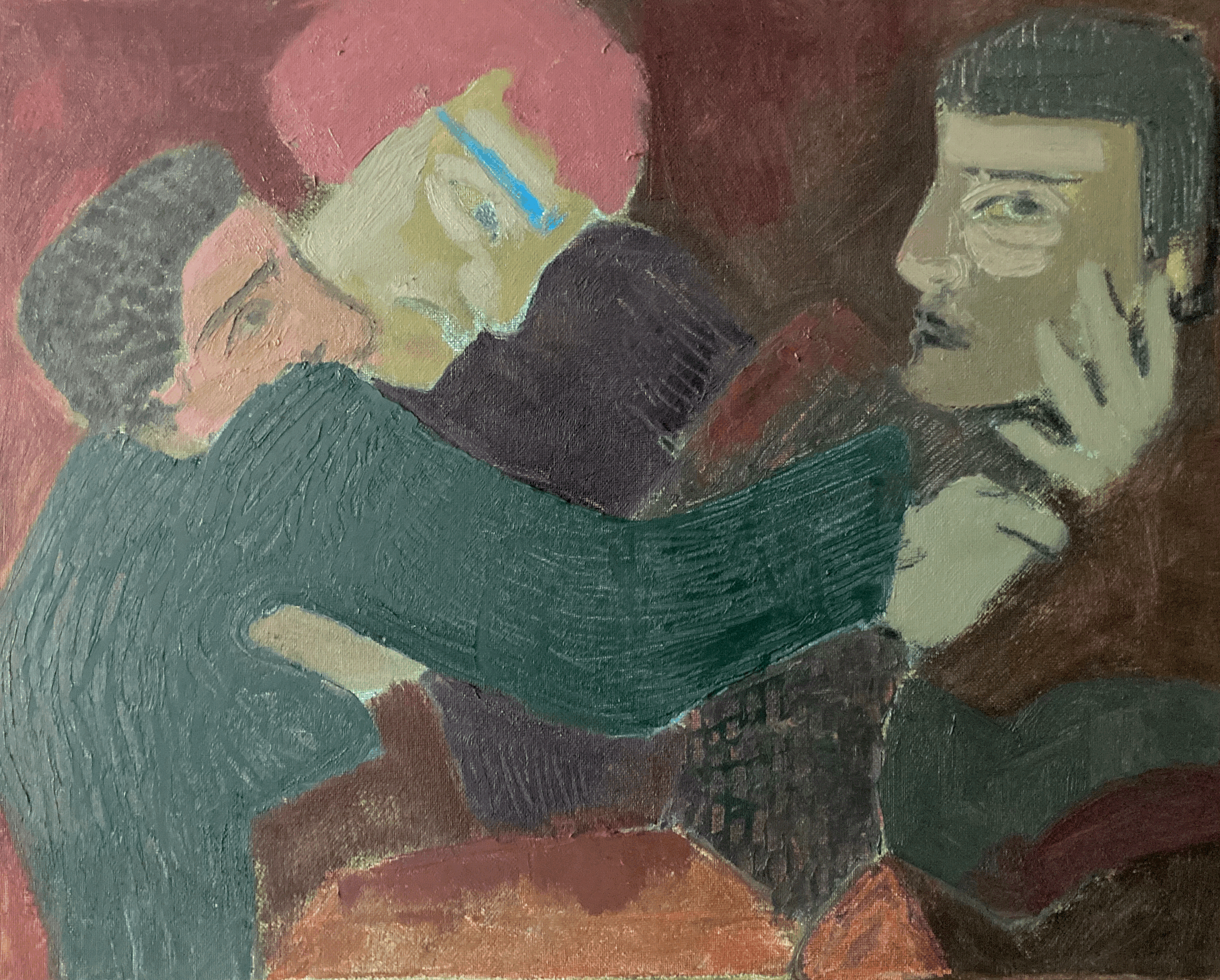 This collection is largely self-referential, working as a conversation between poetry, memory and self-portrait to create symbolic compositions that reconcile and eternalise significant female relationships. The manipulation of the surface sludge of paint and pastel through scoring and scratching creates contours which make these bodies move. The paintings present female relationships as spectacular and conflictual and profoundly connected by love and shared experience. These faces wear specialised expressions of personal conflict and contradiction, celebrating the contemporaneous duality of all feelings in us; suspicion coexists alongside acceptance and anger can be balanced in tenderness. We are made up of all kinds of incoherent things and so are these paintings. The textural dimension of the work tries to contribute to this duality by physically working conflict into the painting, through the rigid and fluid acts of pressure that demonstrate we are as much one feeling as we are its opposite.