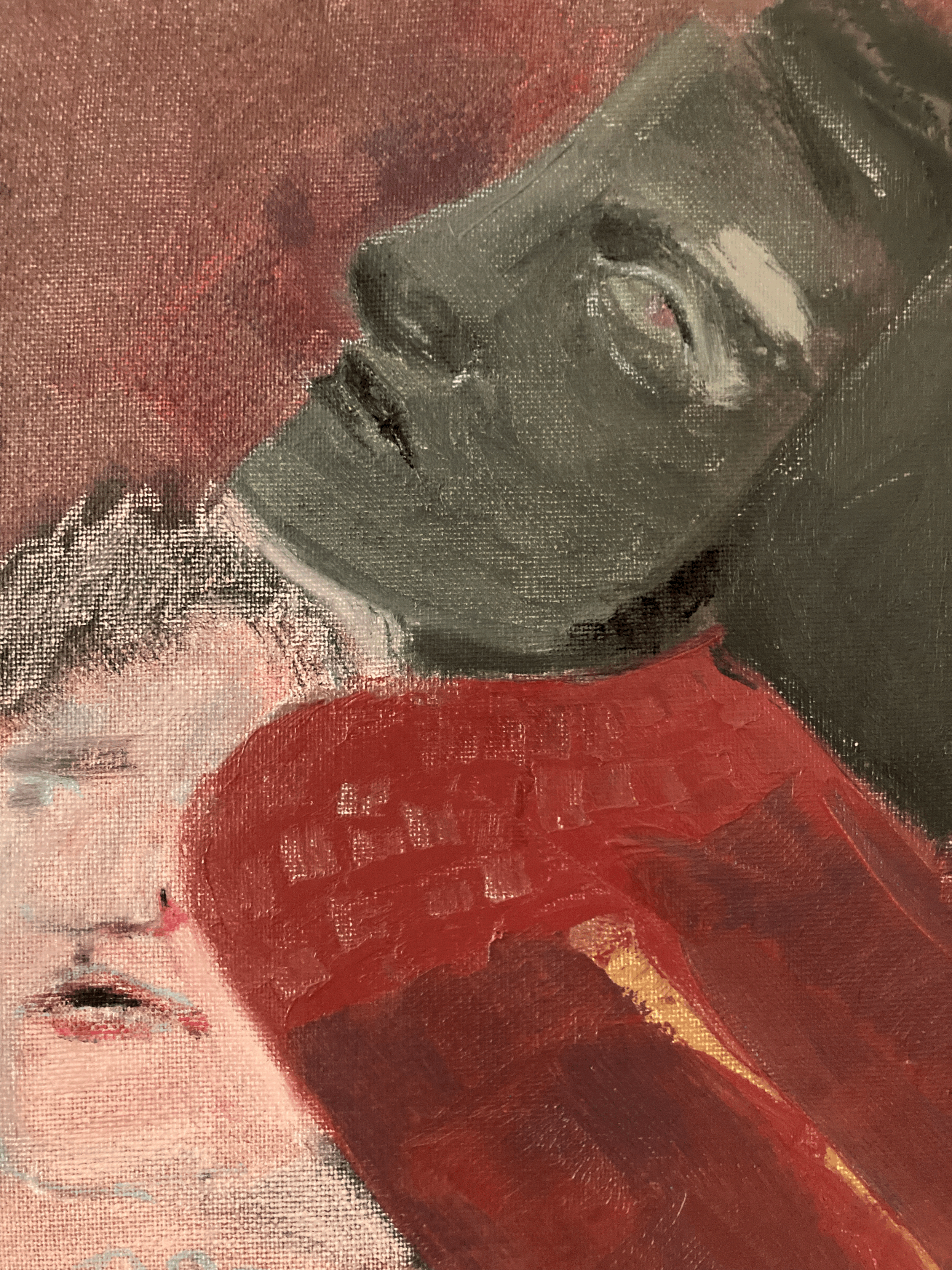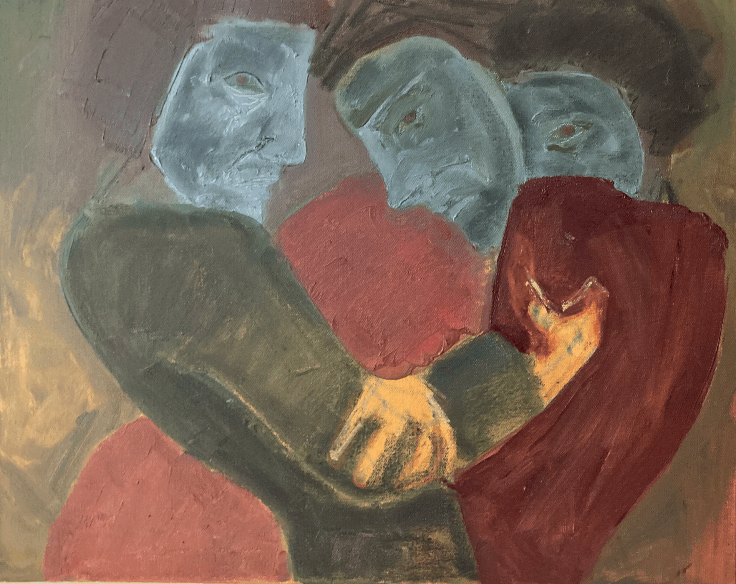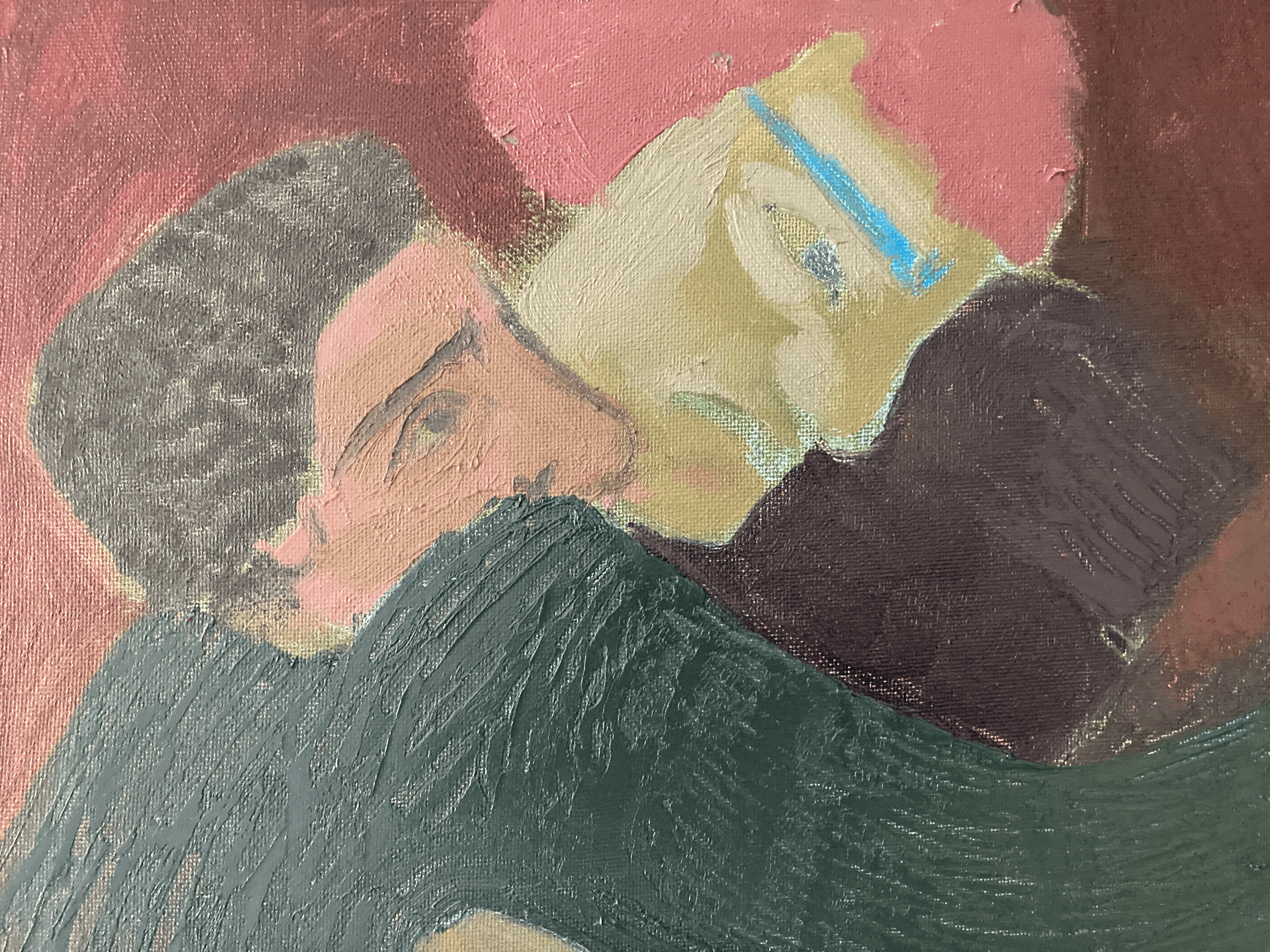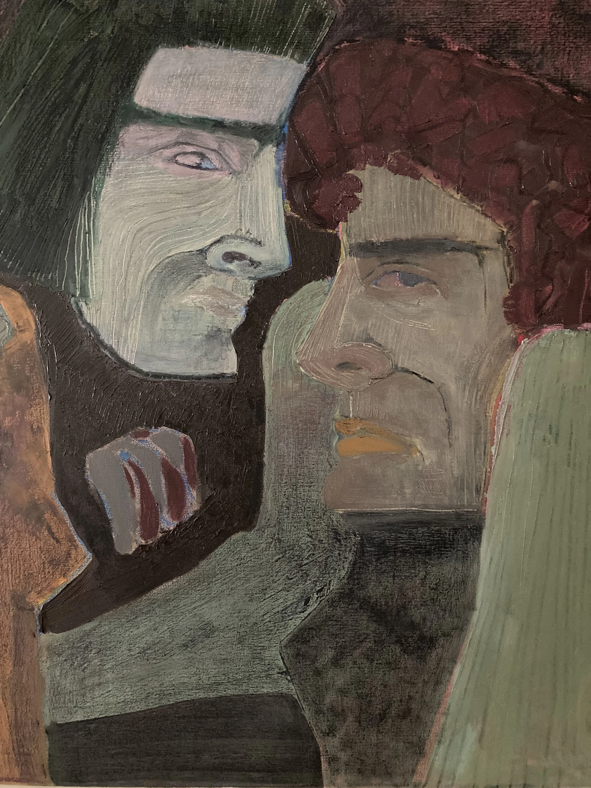 This collection is largely self-referential, working as a conversation between poetry, memory and self-portrait to create symbolic compositions that reconcile and eternalise significant female relationships. The manipulation of the surface sludge of paint and pastel through scoring and scratching creates contours which make these bodies move. The paintings present female relationships as spectacular and conflictual and profoundly connected by love and shared experience. These faces wear specialised expressions of personal conflict and contradiction, celebrating the contemporaneous duality of all feelings in us; suspicion coexists alongside acceptance and anger can be balanced in tenderness. We are made up of all kinds of incoherent things and so are these paintings. The textural dimension of the work tries to contribute to this duality by physically working conflict into the painting, through the rigid and fluid acts of pressure that demonstrate we are as much one feeling as we are its opposite.